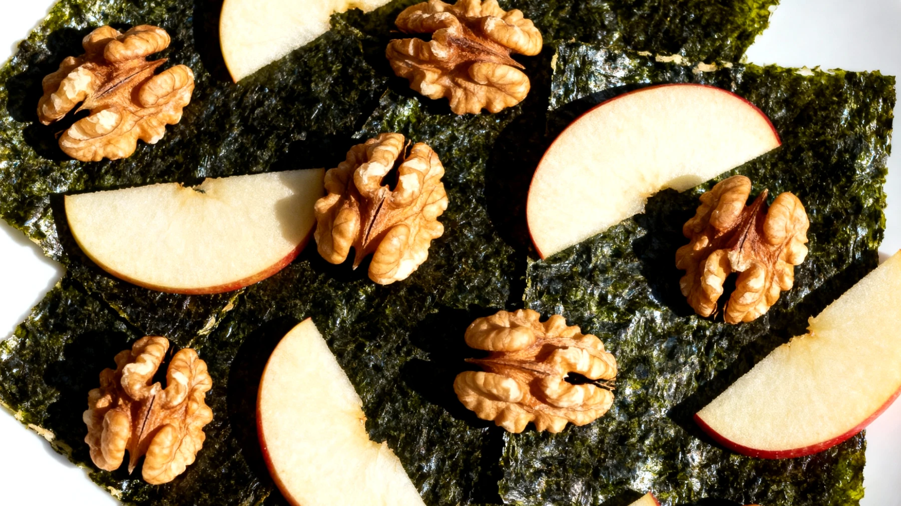 Die Zubereitung selbst ist denkbar einfach: Ein Nori-Blatt wird mit einigen Walnusshälften und dünn geschnittenen Apfelscheiben belegt. Wer möchte, kann das Blatt aufrollen oder einfach zusammenfalten. Der Kontrast zwischen der salzigen Umami-Note der Alge, der erdigen Bitterkeit der Walnuss und der fruchtigen Süße des Apfels erzeugt ein überraschend harmonisches Geschmacksprofil.