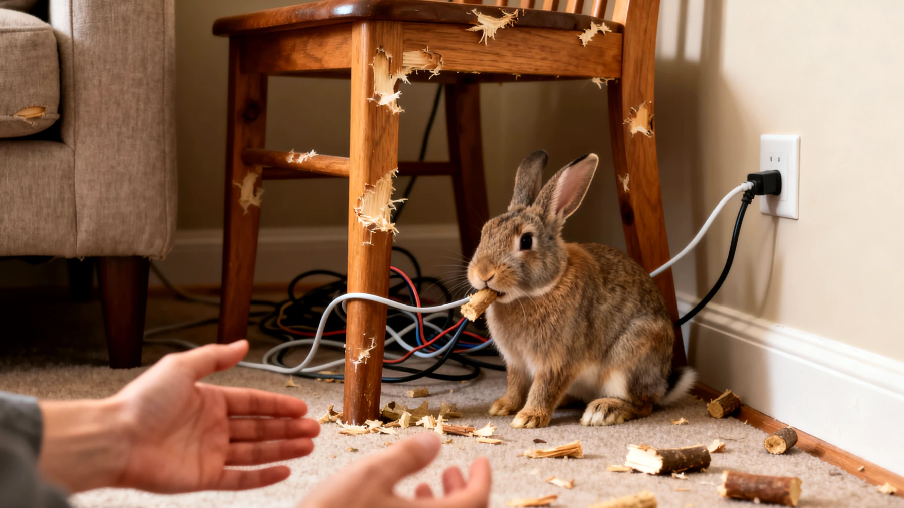Parallel zur Ernährungsoptimierung müssen wir die Umgebung kaninchengerecht gestalten. Sichere alle Kabel mit Kabelkanälen oder Bitterspray – letzteres enthält Bitterstoffe, die Kaninchen natürlich meiden. Stelle Möbelbeine mit Holzschutzgittern oder dicken Zweigen um das Möbel herum.