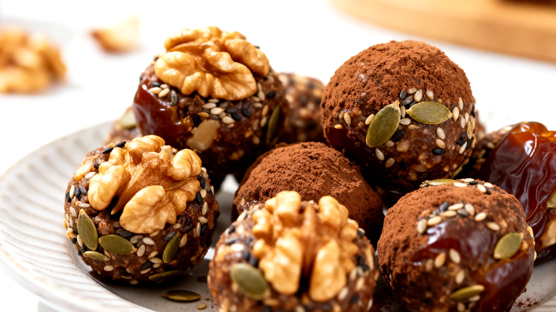 Datteln fungieren als natürliches Bindemittel und Süßungsmittel zugleich. Sie enthalten schnell verfügbare Kohlenhydrate sowie B-Vitamine, die am Energiestoffwechsel beteiligt sind. Ihr Gehalt an Tryptophan – einer Vorstufe des Neurotransmitters Serotonin – macht sie besonders wertvoll für die mentale Balance.